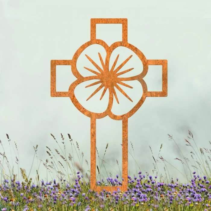 Remember those who have sacrificed their lives for their country with this memorial ground spike. Made from high-quality sheet steel and left to naturally age over time, leaving this rustic effect finish. This cross-ground spike features a silhouette cross, with a poppy attached to the centre of the structure. This outline draws attention to the poppy itself, and the meaning it has behind it. Complete with a single spike to allow for easy installation onto your lawn or back garden.