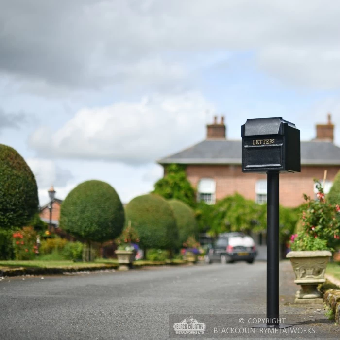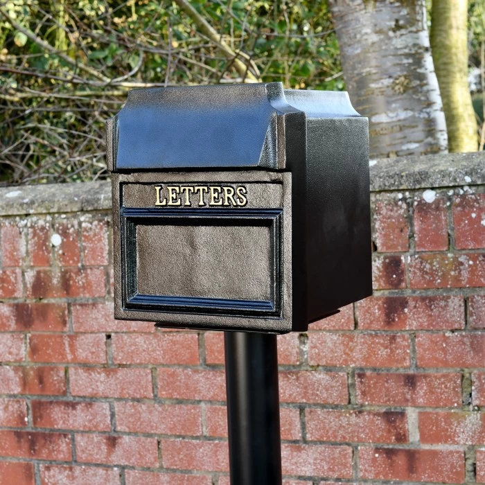 Designed to sit on a free standing column, this beautiful post box has been classically styled as it has been crafted from cast aluminium and finished in a heavy duty powder coated black finish, meaning it will complement any exterior setting and design. With gold ‘LETTERS’ wording on the front, the rear of the post box requires a key, ensuring that your mail is kept safe and secure from theft. The column has four pre-drilled holes which will require bolts or concrete to fix into place.