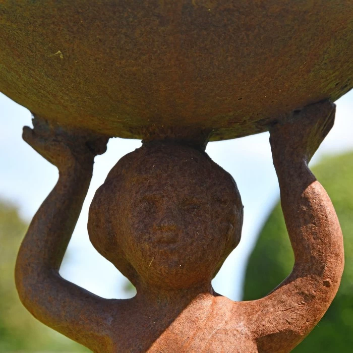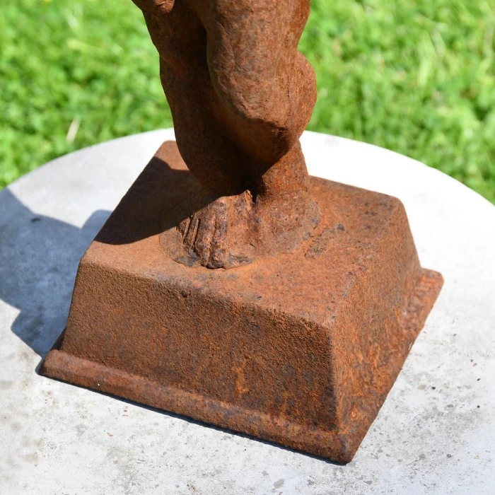 Created from cast iron and left to naturally rust in the elements, this beautiful and striking sculpture doubles up as a bird bath. Featuring a male cherub standing upon a block, he holds a bird bath bowl above his head whilst a small bird perches on the corner. The bird bath bowl features scalloped edging adding to the overall style of the piece. Simply striking in design and construction, this bird bath would look fantastic placed on a column in the centre of a freshly manicured garden.