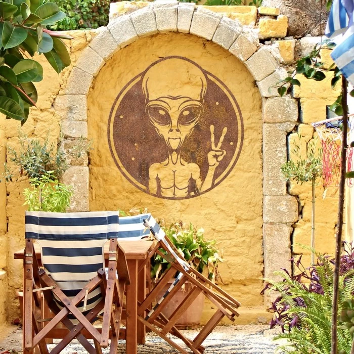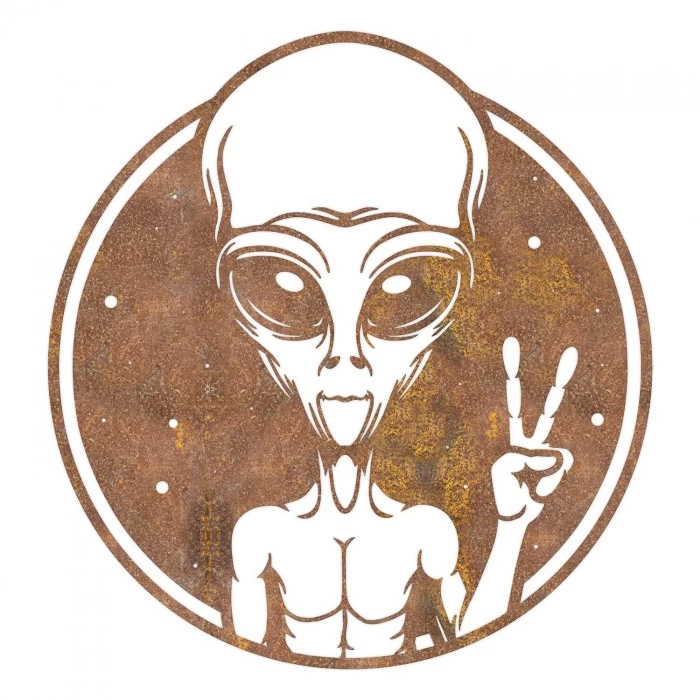 Crafted from high quality steel and left in its rustic natural finish, this wall art will certainly bring quirkiness and conversation to your home. Designed with an alien throwing a peace sign with his two fingers, this wall art is ideal for movie or sci-fi fanatics. Made in house, this wall art has detailing throughout and includes a space like background adding to the overall theme of the wall art. Designed to be wall mounted, this wall art can be hung either indoors or outdoors, ideal for bedrooms, movie rooms and garden settings.