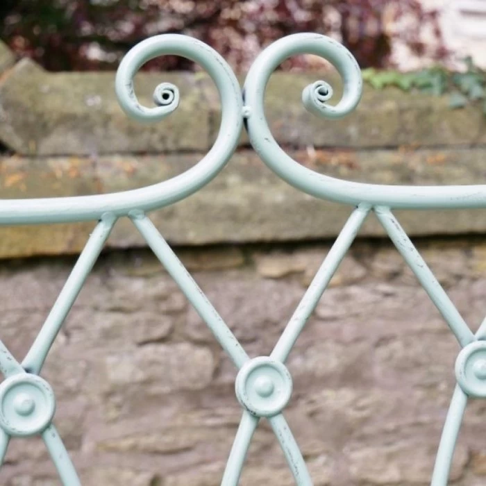 Crafted from heavy duty metal and finished in a light pistachio green, this metal garden bench will complement any garden setting, colour scheme and style. Designed with a fantastic backrest of curved metal which are conjoined together with button embellishments, this bench features small scroll detailing on the top of the backrest and within the arms. Stood on four feet with an additional supporting bar at the back, this two seater bench is ideal for placement on patios, in gardens and under trees for ultimate relaxation.