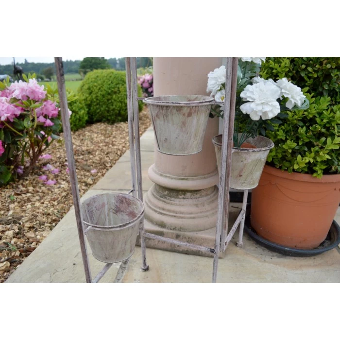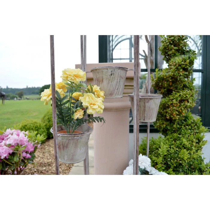 The simplicity of this plant stand is effortlessly charming, allowing those with little outdoor space to create a beautiful display of potted flowers. The screen features three hinged panels which can be positioned as needed, each of the screens have been fitted with a circular bracket and two pots.
