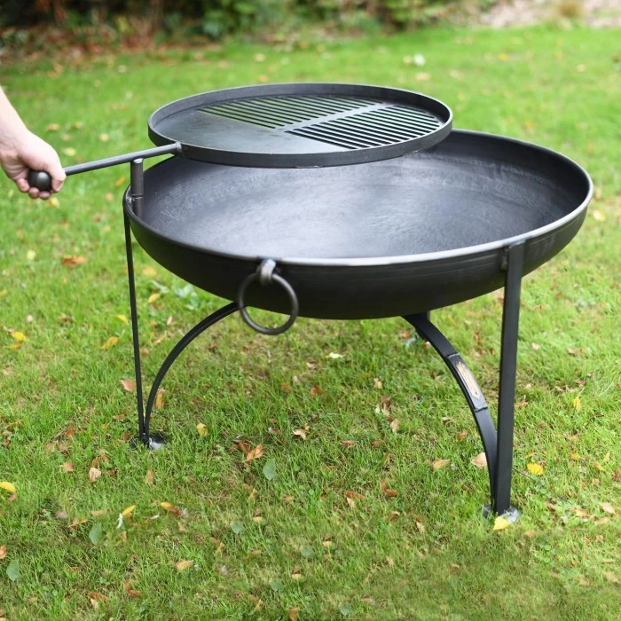 Handcrafted from high-quality steel and finished in a modern black effect, this multi-purpose fire bowl takes inspiration from traditional Indian Kadai bowls with a modern twist. Complete with an integral BBQ arm, this wood burner is perfect for entertaining your family and guests throughout the summer season and can double-up as a BBQ for exploring your outdoor culinary skills. The BBQ arm is circular in shape and features a half grill and hot plate combination – perfect for grilling meat and veg, or for cooking one pot meals such as paella. Ideal for placement on an outdoor patio or porch, this fire pit will provide you with years of dedicated service.Â