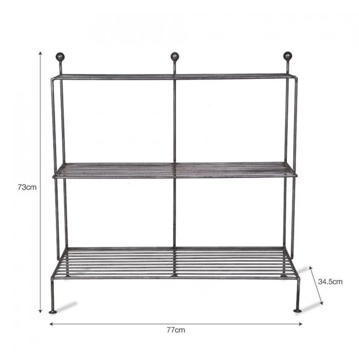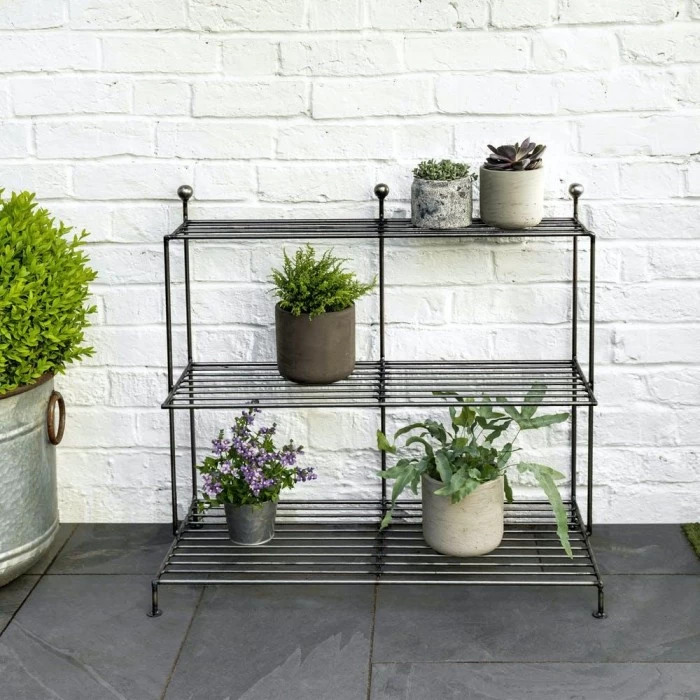 Proud of your potting and want to show it off in a sophisticated way? This three-tiered shelving stand, featuring various depths, allows one to arrange in size order, with larger pots at the bottom and lighter more delicate pots and plants at the top. Crafted from high quality steel and finished in a matt lacquer sealant, this shelving stand can be used both indoors and outdoors, making it ideal for conservatories and greenhouses. Featuring three ball finials, this shelving stand comprises of a slatted design ensuring that all plants and pots and steady and sturdy.