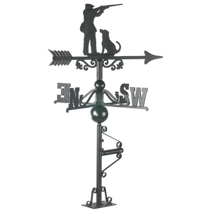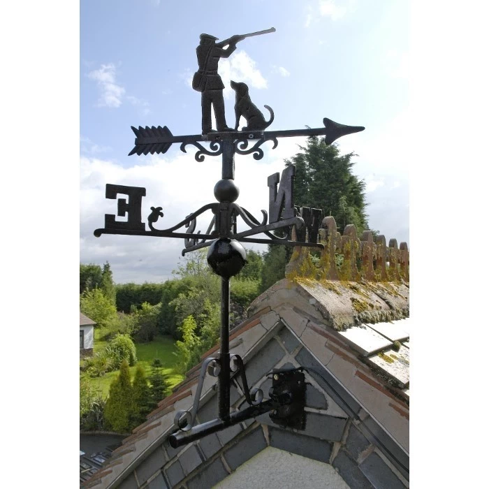 Inspired by game hunting season, this unique weathervane is the ideal exterior decoration for anyone who loves or participates in the popular British sport. Crafted from a combination of thick steel and high-quality cast iron, this weathervane features the silhouette of a hunter, his rifle, and his four-legged companion. Fully finished in a sleek midnight black to highlight each little detail, this weathervane would look ideal fitted to any exterior roof, wall, or large shed setting. Complete with a universal bracket, traditional fletched arrow, and directional arms for easy installation and use.