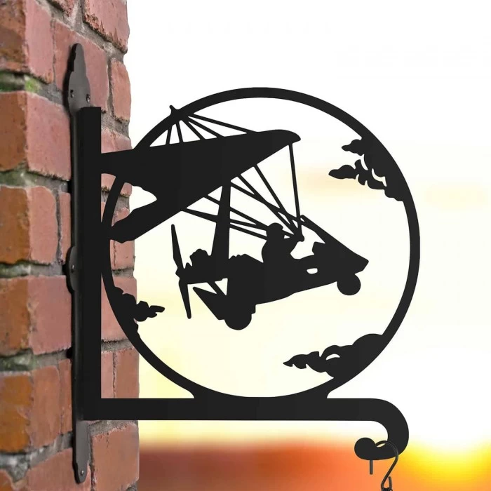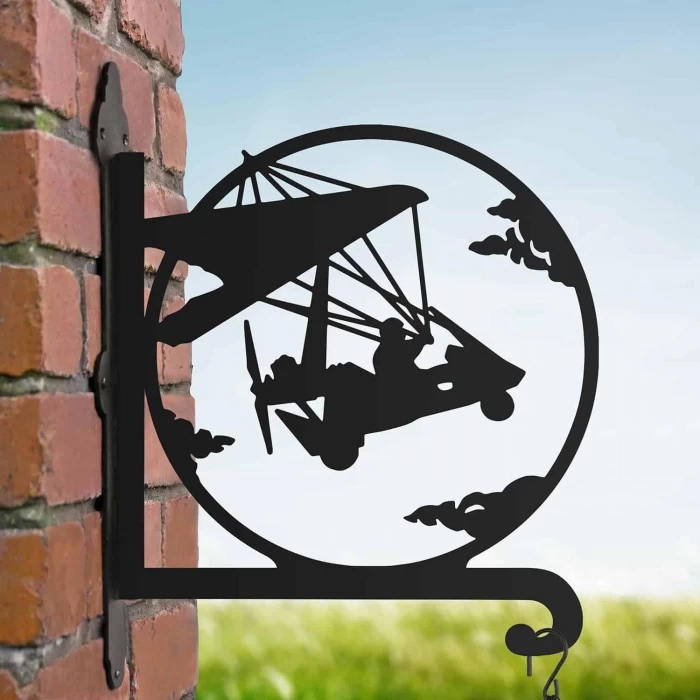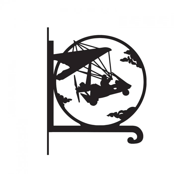A must-have for all you adrenaline junkies out there! Made from a combination of cast iron, and steel on-site by our expert team, this hanging basket bracket comes ready for mounting and is complete in a sleek midnight black finish. With a stunning circular topper that showcases a man operating a microlight with ease, surrounded by clouds for some added authenticity. Whether you do this yourself or have always wanted to, what better way to show off to friends and family than with this hanging basket bracket?
