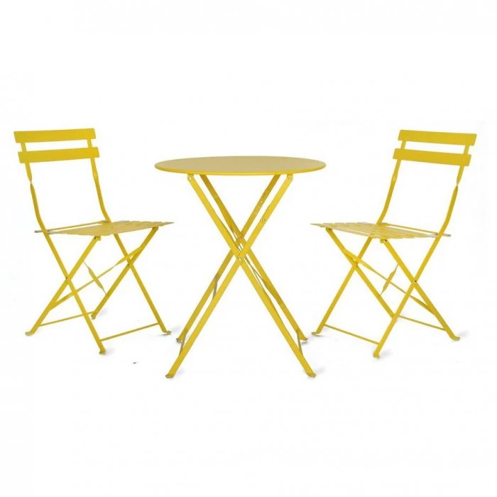 Bring some sunshine to your garden and patio area with this bright and colourful yellow two-seater bistro set. Crafted from high quality steel and finished in a vibrant yellow powder coated finish, this bistro set is the ideal garden furniture accessory to eat brunch on, read a book or simply converse over. Complete with a circular table and two chairs, this bistro set can be folded away with ease, when not in use. The ideal piece of garden furniture for small gardens or for couples to ensure the spring and summer days.