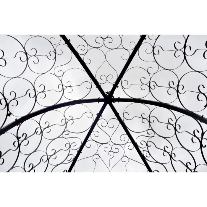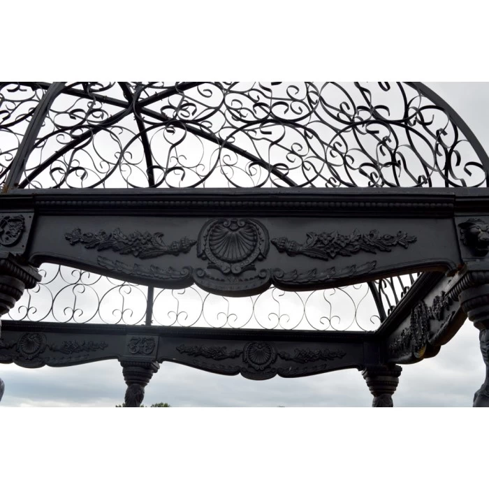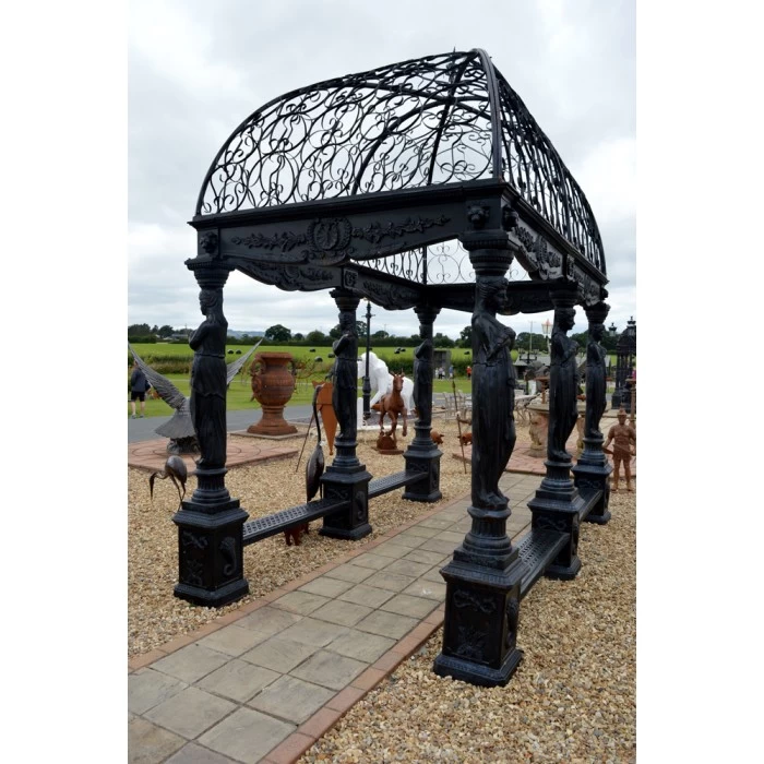 This magnificent gazebo is a spectacular example of traditional metalworking; the elaborate lace work canopy arches in to a majestic dome and has been adorned with ornate scroll detailing. Each of the six stunning pillars has been sculpted in to the form an elegant goddess-like figure. Between each column, a robust lattice work bench has been fitted; providing seating for guests or photographic opportunities.