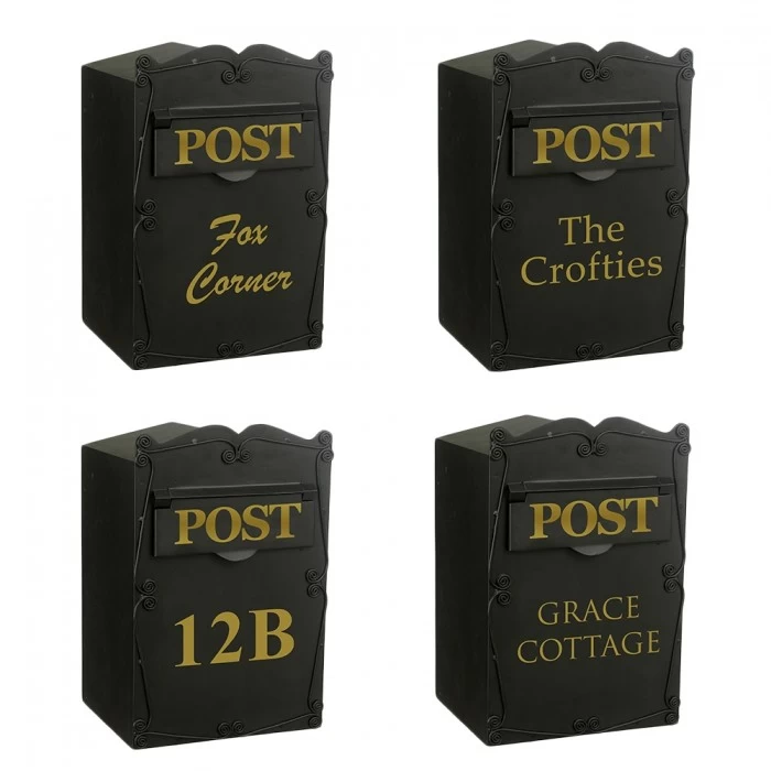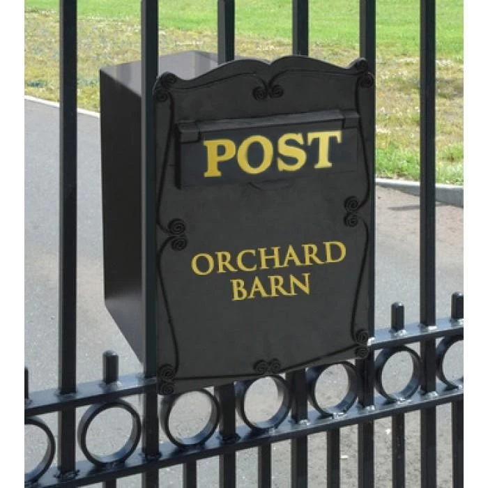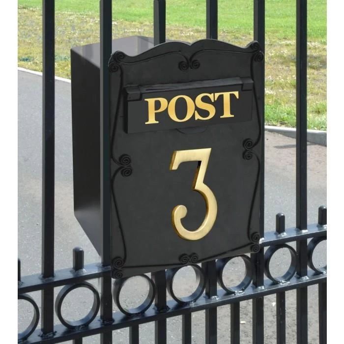 This elegantly designed post box can be fitted with a choice of large six inch numbers. The design can also be personalised with your house name through a sign writing process. The post box has an ornate scrolled detailing around the edges.Â