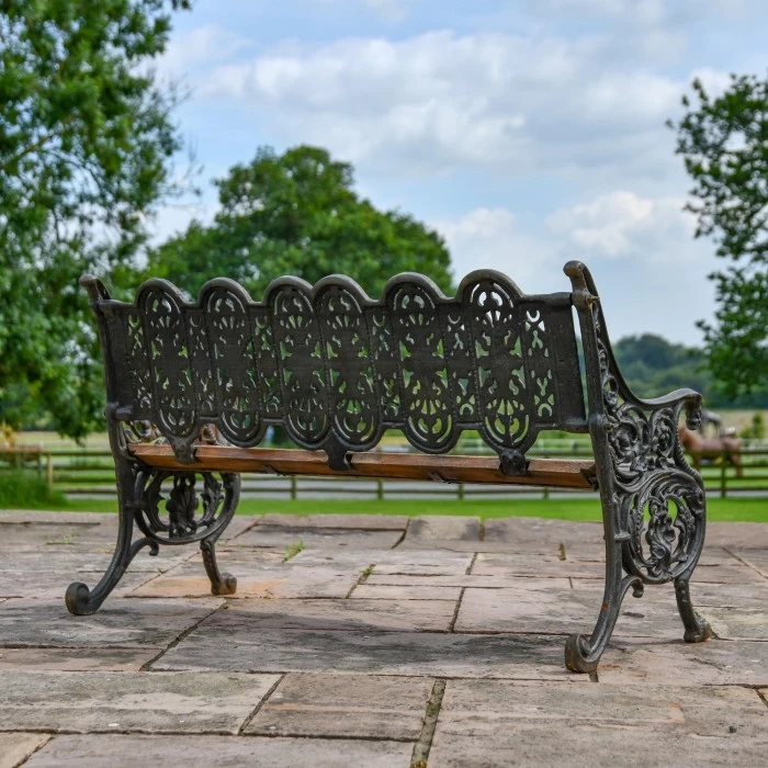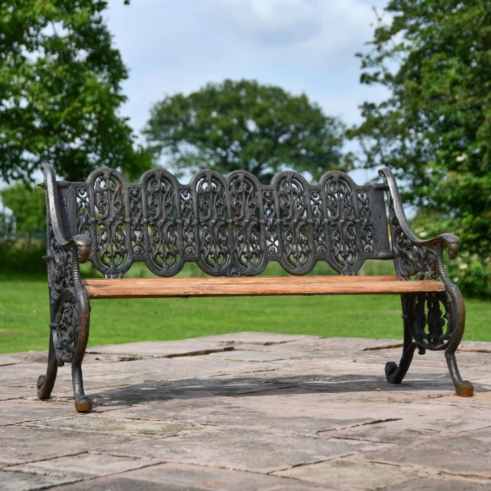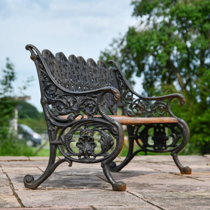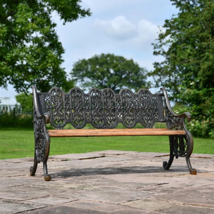 Designed to comfortably seat up to three people, this garden bench is a must-have for any home that loves to entertain throughout the warmer days of the year. Crafted from a combination of robust cast iron and natural wood, this aged black bench takes its inspiration from traditional Gothic design as seen in its floral and foliage adorned framework. Complete with a large backrest, two curved serpent armrests, a classic slatted seat, and four integral legs to ensure both comfort and stability during use. This unique design would look perfect placed within a large lawn area or upon a porch or patio, offering comfort and style throughout every season of the year!