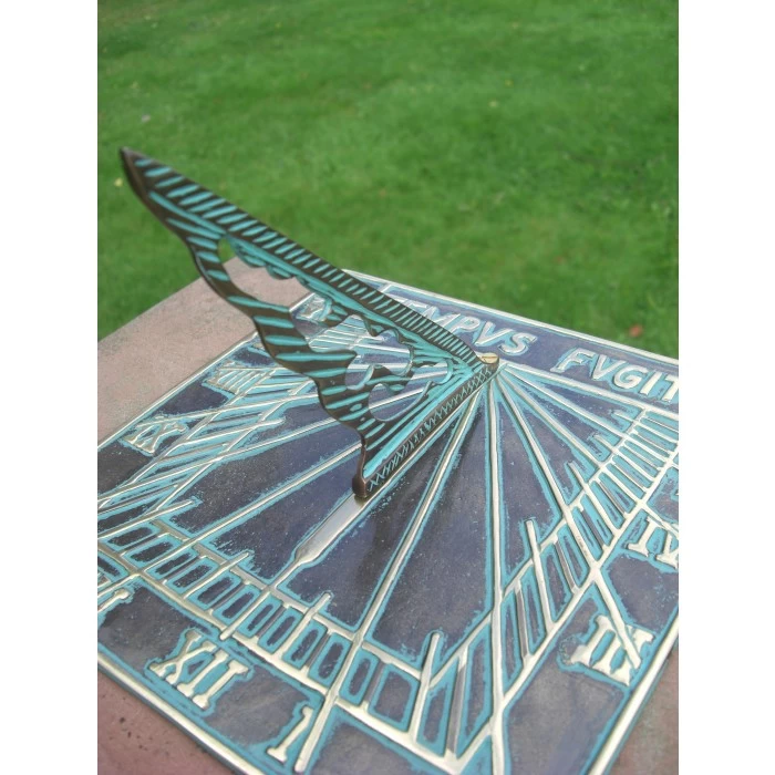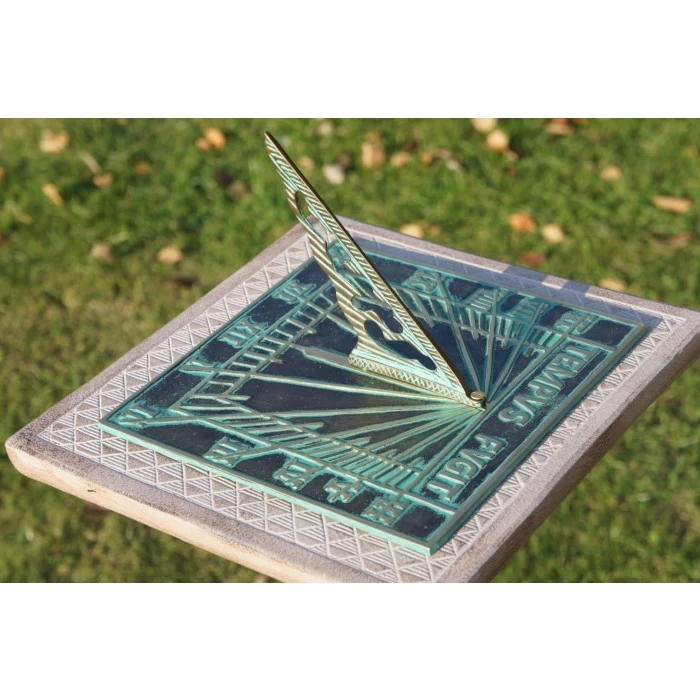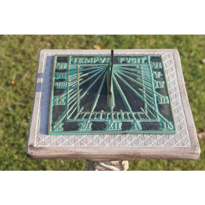 Square in shape, this wonderful sundial features the Latin phrase ‘Tempus Fugit’ which roughly translates to ‘Time Flies’ in English. Crafted from solid brass with a Verdigris finish throughout, this sundial features Roman numerals around the outer part, whilst sun ray beams expand from the central gnomon. Its colourings will complement and blend into a blossoming green garden or ground setting. A wonderfully decorative item which will add those finishing touches to the outdoor space.Â