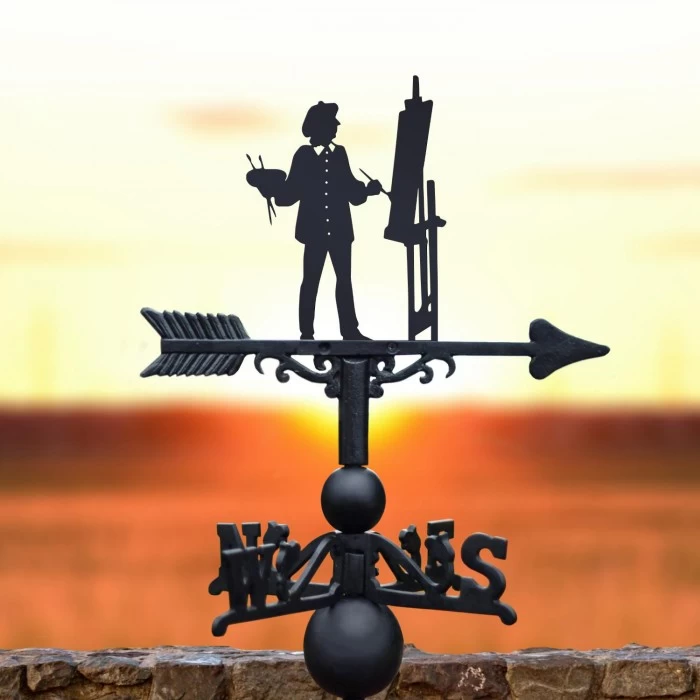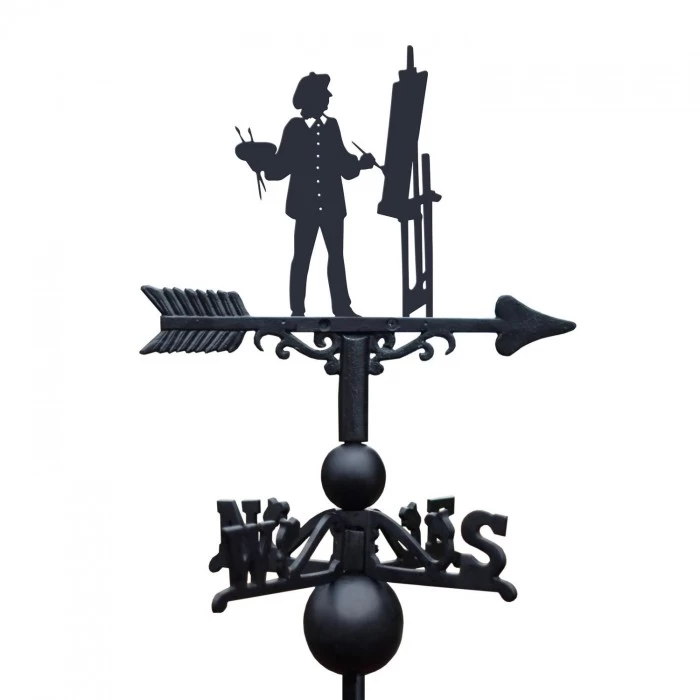Whether you consider yourself a modern-day Picasso or you just love to paint in your spare time, this endlessly quirky weathervane has been finished in a sleek midnight black and features the silhouette of an artist in action, complete with their beret, easel and painter’s palette. Crafted from a combination of thick steel and robust cast iron, this weathervane is bound to add character to any exterior setting and would look great placed on a roof-top, exterior wall, or large shed. Supplied with a universal bracket for easy horizontal or vertical fitting, this design also comes complete with a traditional fletched arrow and directional arms for true authenticity.