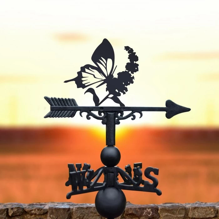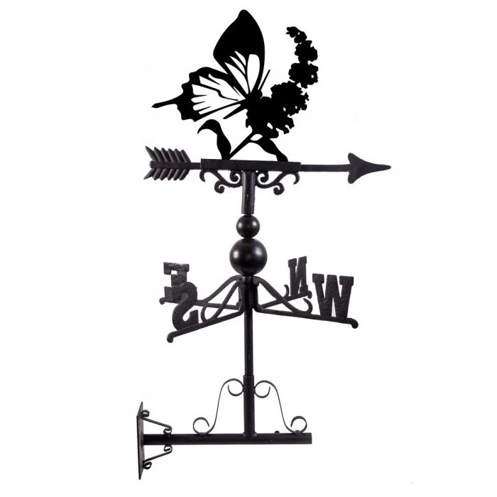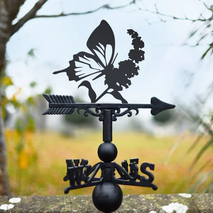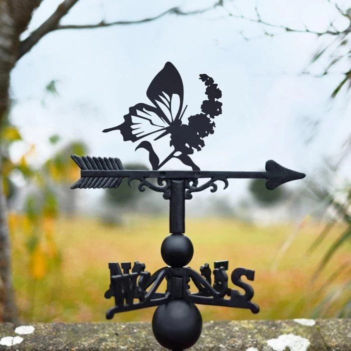 The perfect way to invite additional natural charm into any outdoor setting, this beautifully detailed weathervane features the silhouette of a butterfly perched atop a blooming flower. Crafted from a combination of thick steel and robust cast iron, this weathervane also features a sleek midnight black finish which looks simply stunning against the backdrop of a setting sky. Designed for wall or roof-top mounting, this design comes complete with a universal bracket, fletched arrow and directional arms for easy installation and use. A lovely way to jazz up any garden space!