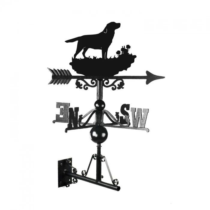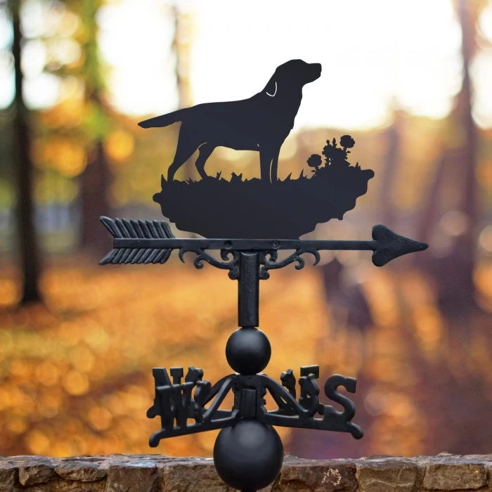 Widely known for their playful and loyal personalities, this quirky weathervane features the detailed silhouette of a Labrador standing proudly within a field of flowers and foliage. Handcrafted from a combination of high-quality steel and robust cast iron, this weathervane has been finished in a sleek midnight black and is the ideal way to add a touch of character to the exterior of any home or property. Complete with a universal bracket, a fletched arrow, and directional arms for easy wall or roof mounting and use. This design would also make a lovely gift for those in your life who own or love this affectionate breed!