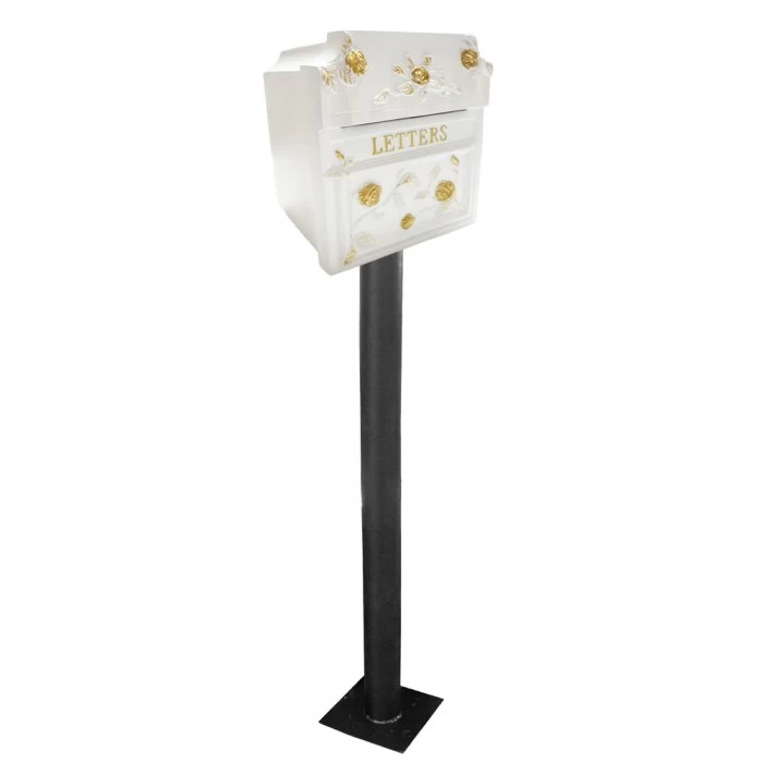 This post box is beautifully styled with old English roses, picked out in regal gold paint. Cast in solid aluminium the mail box is wonderfully sturdy and ornate, with a wide posting aperture at the front.